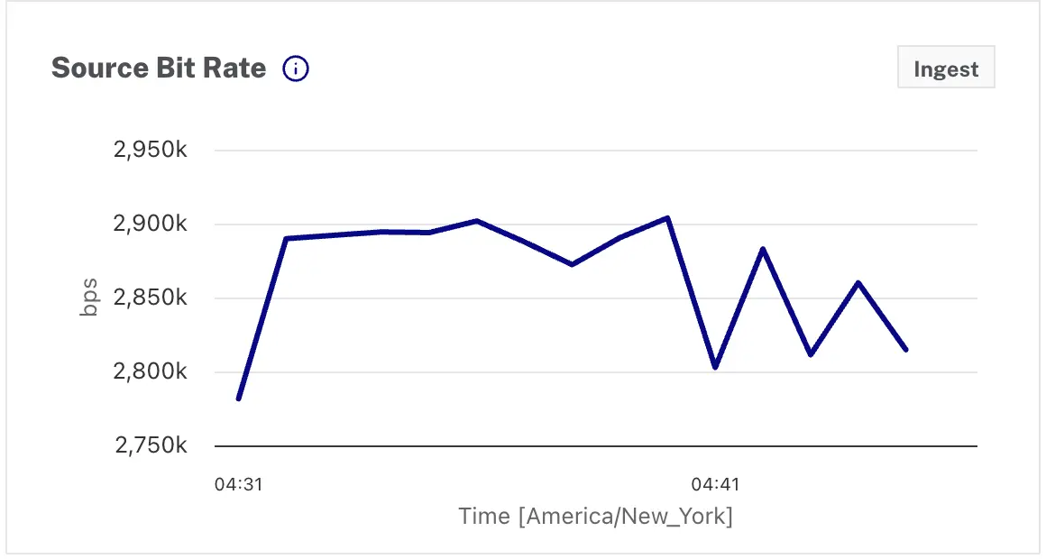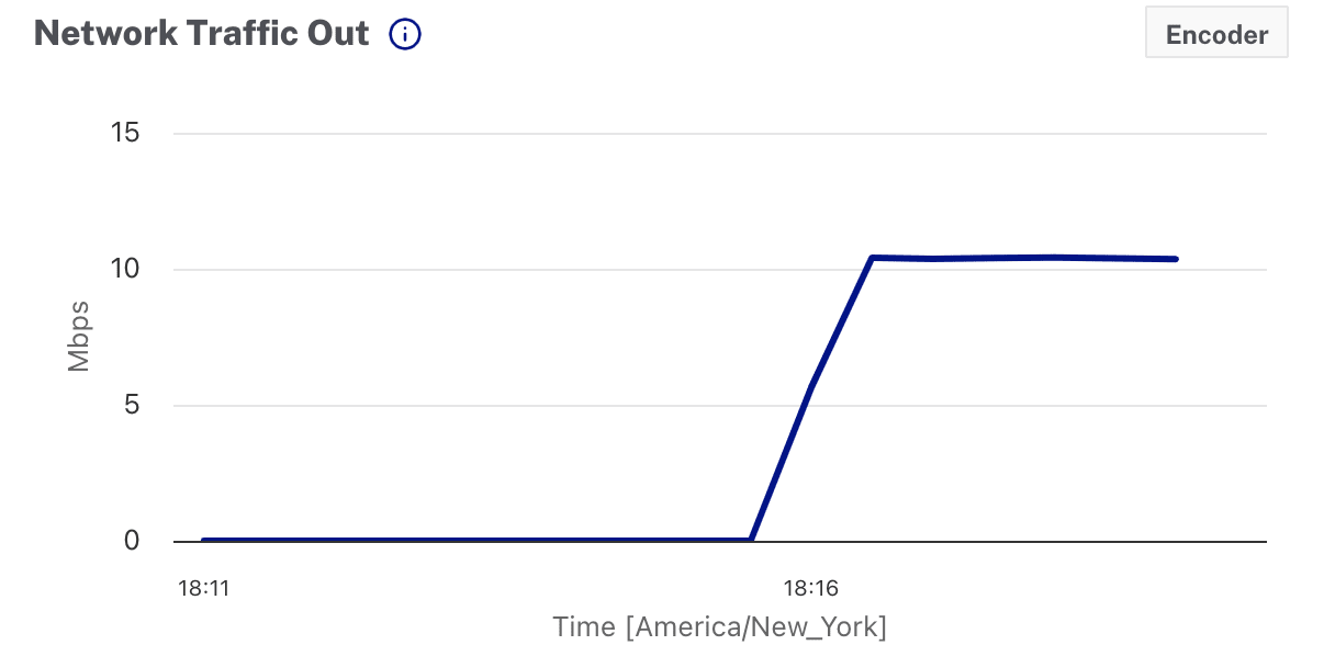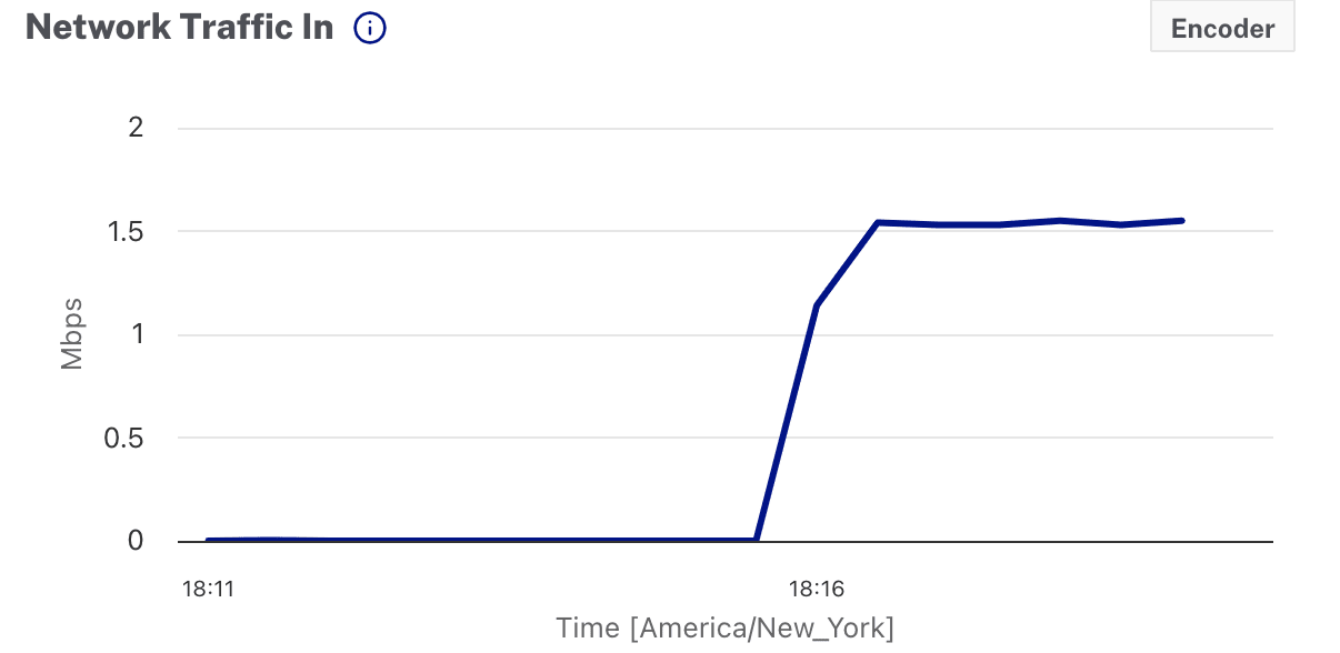 - ネットワークトラフィック(入力) - エンコーダーに流入するネットワークトラフィックのレート。受信したすべてのインジェストトラフィック(プッシュ入力、プル入力、上流・下流システムからの応答、DNS解決やNTPなどのインスタンストラフィック)を含みます。エンコーダーがインジェストを行っていない場合でも、一定量のトラフィックがあります。