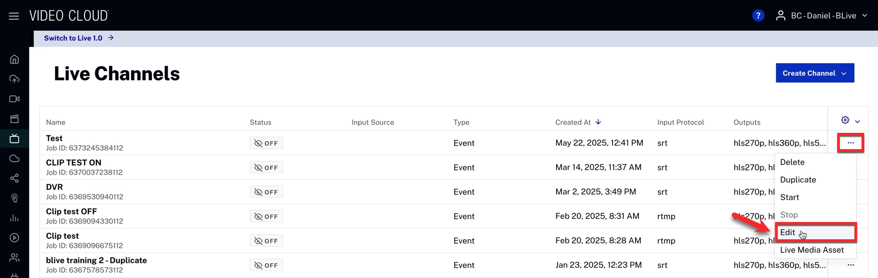 - ライブ チャンネル名の横にある 3 点アイコン (...) をクリックします。
