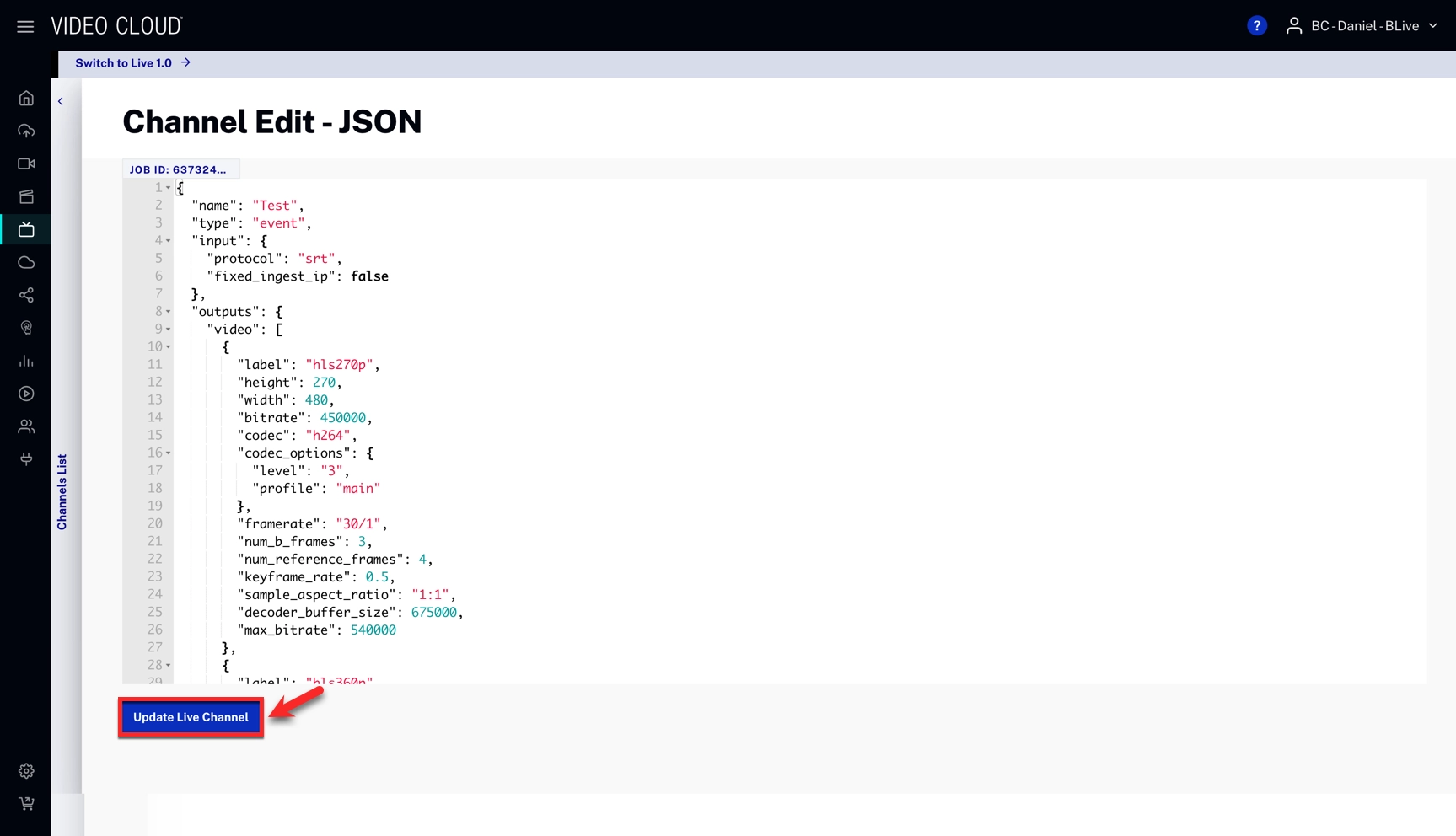 - 編集 - Channel Edit - JSON を表示・編集することができます(ストリーミング停止時のみ利用可能)。