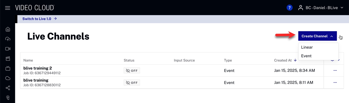 2種類のオプションが表示されます。契約内容により、イベント チャンネル、リニア チャンネル、またはその両方の作成が可能です。通常、イベント チャンネルは単発または定期的な短時間イベント用、リニア チャンネルは 24時間365日 稼働のライブ用に使用されます。課金方法が異なるため、詳細は弊社担当営業までお問い合わせください。